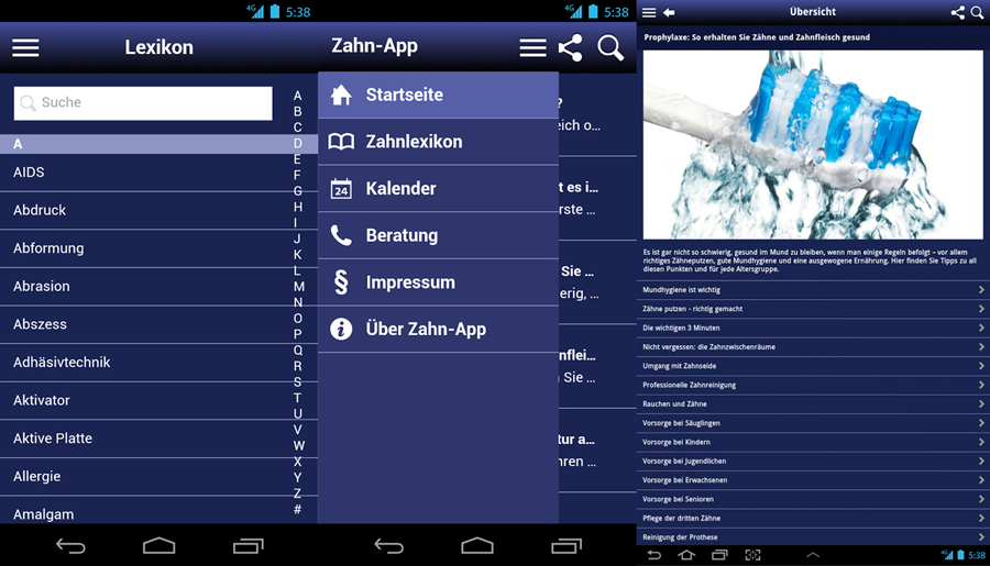 Hinter dieser eher banalen Bezeichnung verbirgt sich eine Anwendung der Kassenärztlichen Vereinigung. Sie dient vorrangig der Bereitstellung von Informationen zur Verwaltung des Bonusheftes, Zahnpflegetipps für Kinder und Erwachsene, eine Zahnputzuhr für Kinder sowie ein recht umfangreiches Zahnlexikon. Die integrierte Suche von Zahnärzten im Notdienst beschränkt sich jedoch leider noch auf Baden Württemberg. Selbstverständlich steht auch diese App den Nutzern kostenfrei zur Verfügung. Sie läuft über Android und iOS gestützte Geräte.
