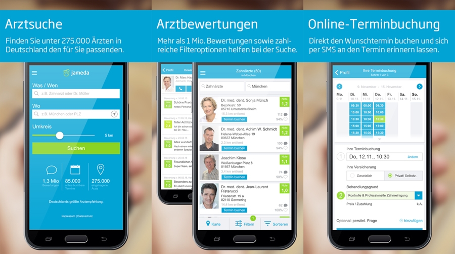 Im medizinischen Bereich sind Bewertungsplattformen sehr beliebt. Eine dieser Bewertungs-Apps stellt Jameda dar. Nutzen daraus können nicht nur die Patienten ziehen, sondern auch den bewerteten Zahnärzten dient es zu Verbesserung ihres Qualitätsmanagements. Für den Patienten stellt Jameda eine große Zeitersparnis dar. Im Vorfeld kann er sich nämlich über die angebotenen Behandlungsmöglichkeiten online informieren und mittels vorhandener Bewertungen einen ersten Eindruck von Arzt und Praxis erhalten. Weiterhin bietet diese App die Möglichkeit der direkten Kontaktaufnahme. Aufgrund der mobilen Verfügbarkeit lässt sich so auch unterwegs schnell Hilfe organisieren. Jameda steht den Nutzern kostenlos zur Verfügung und wird sowohl für Android als auch für iOS angeboten.